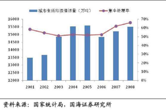 固體廢物可以分為工業(yè)固廢、生活垃圾及危險廢物,而后者的數(shù)量比重很小。2001年至2009年間,工業(yè)固廢的產(chǎn)生量從約9億噸激增到約21億噸,年均復(fù)合增長率達(dá)到12%。由于生活垃圾的產(chǎn)生量比較難統(tǒng)計,在統(tǒng)計局給出的數(shù)據(jù)中一般用垃圾清運量指標(biāo)來代替。生活垃圾的實際產(chǎn)生量約為清運量的兩倍,且清運比逐年上升趨勢。2001-2008年,城市垃圾產(chǎn)量復(fù)合增長率為5%,而垃圾清運量的增速僅為2.03%,整體來看,垃圾清運的速度不及垃圾產(chǎn)生的速度,垃圾圍城現(xiàn)象出現(xiàn),垃圾處理問題開始引起民眾和政府的高度重視。截止2007年,我國未經(jīng)處理的城市生活垃圾累計堆存量已達(dá)70多億噸,侵占土地面積超過5億多平方米,全國660個城市中有約200個城市陷入垃圾包圍之中。深圳市創(chuàng)新投資集團(tuán)有限公司發(fā)展